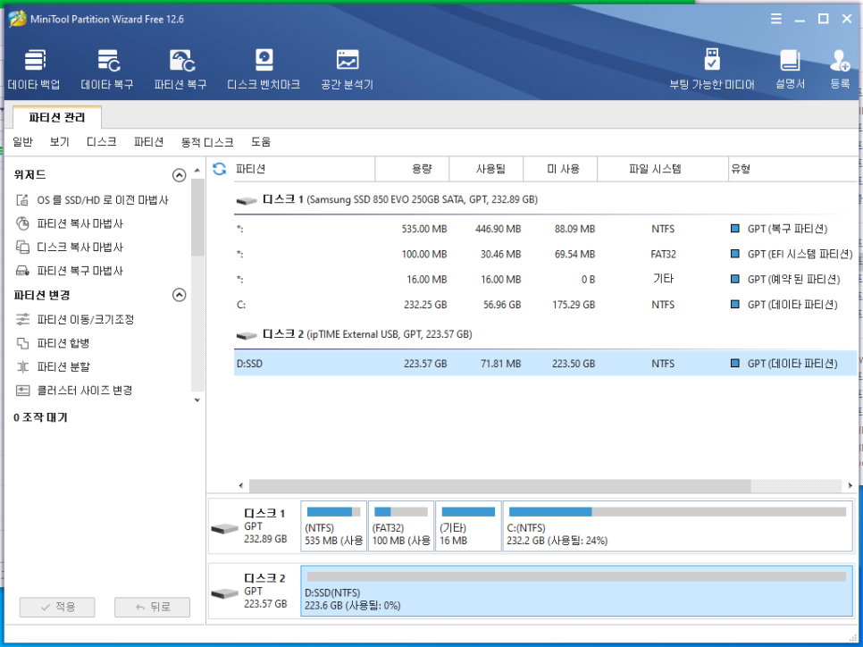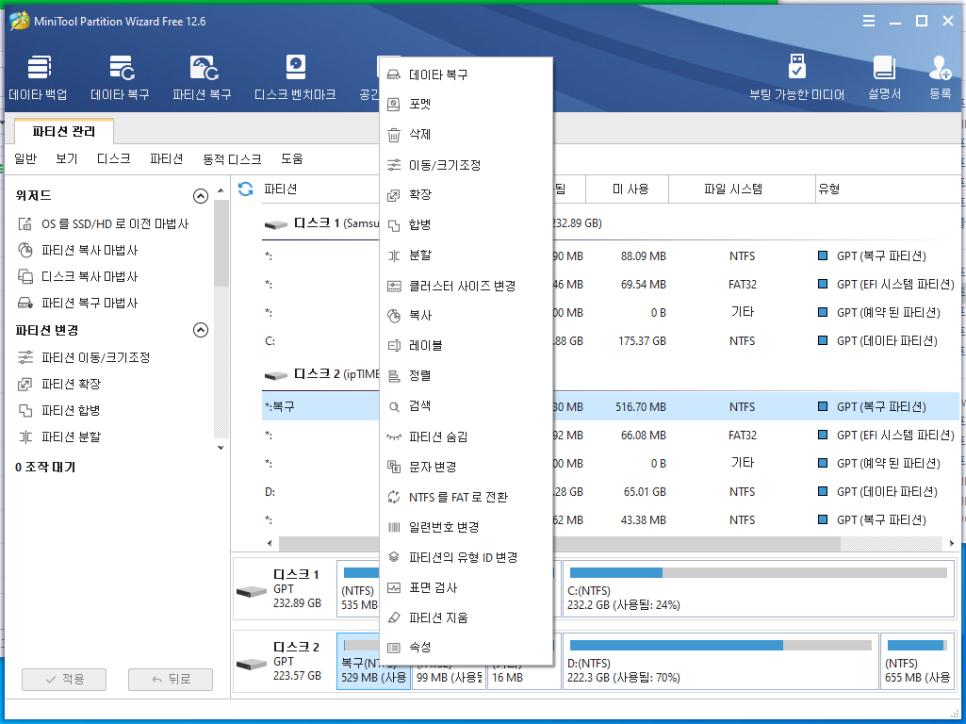 일반적으로 파티션을 관리하려면 윈도우에 포함된 디스크 관리를 이용하면 파티션 생성 / 삭제가 가능합니다.